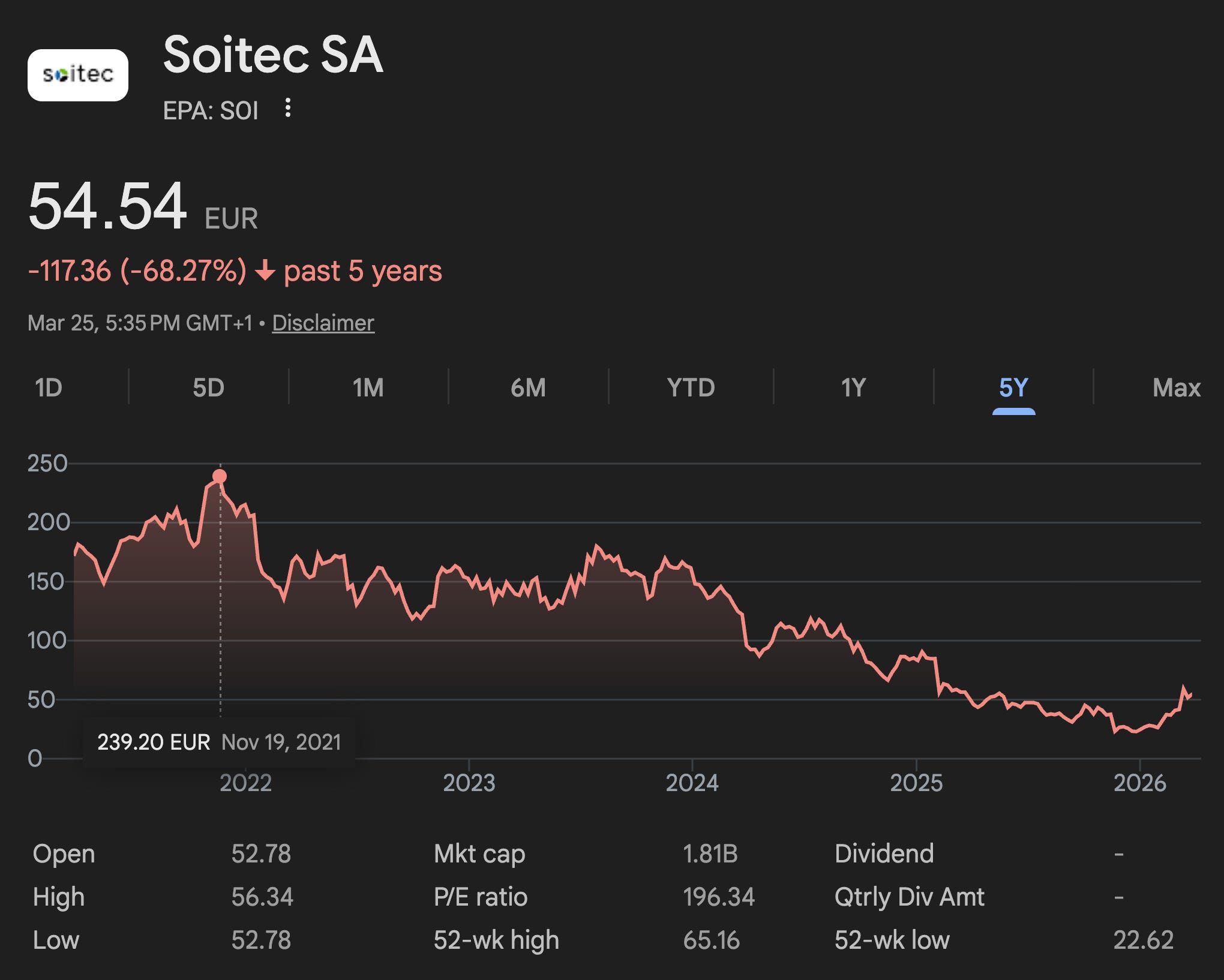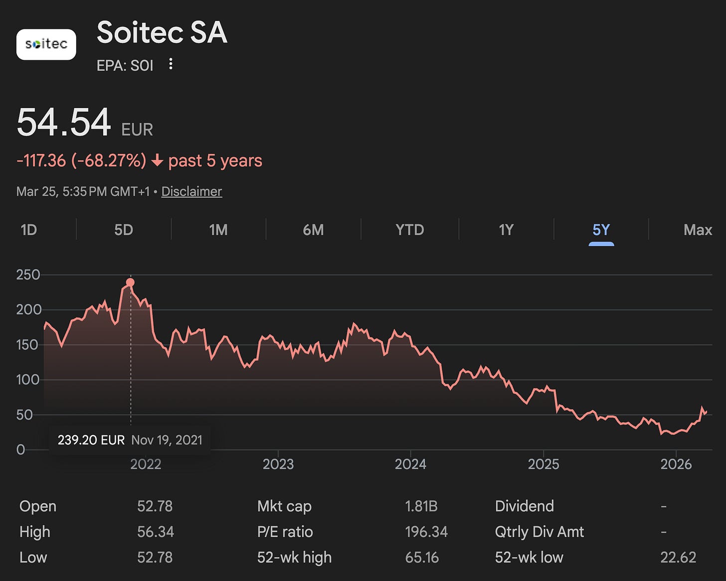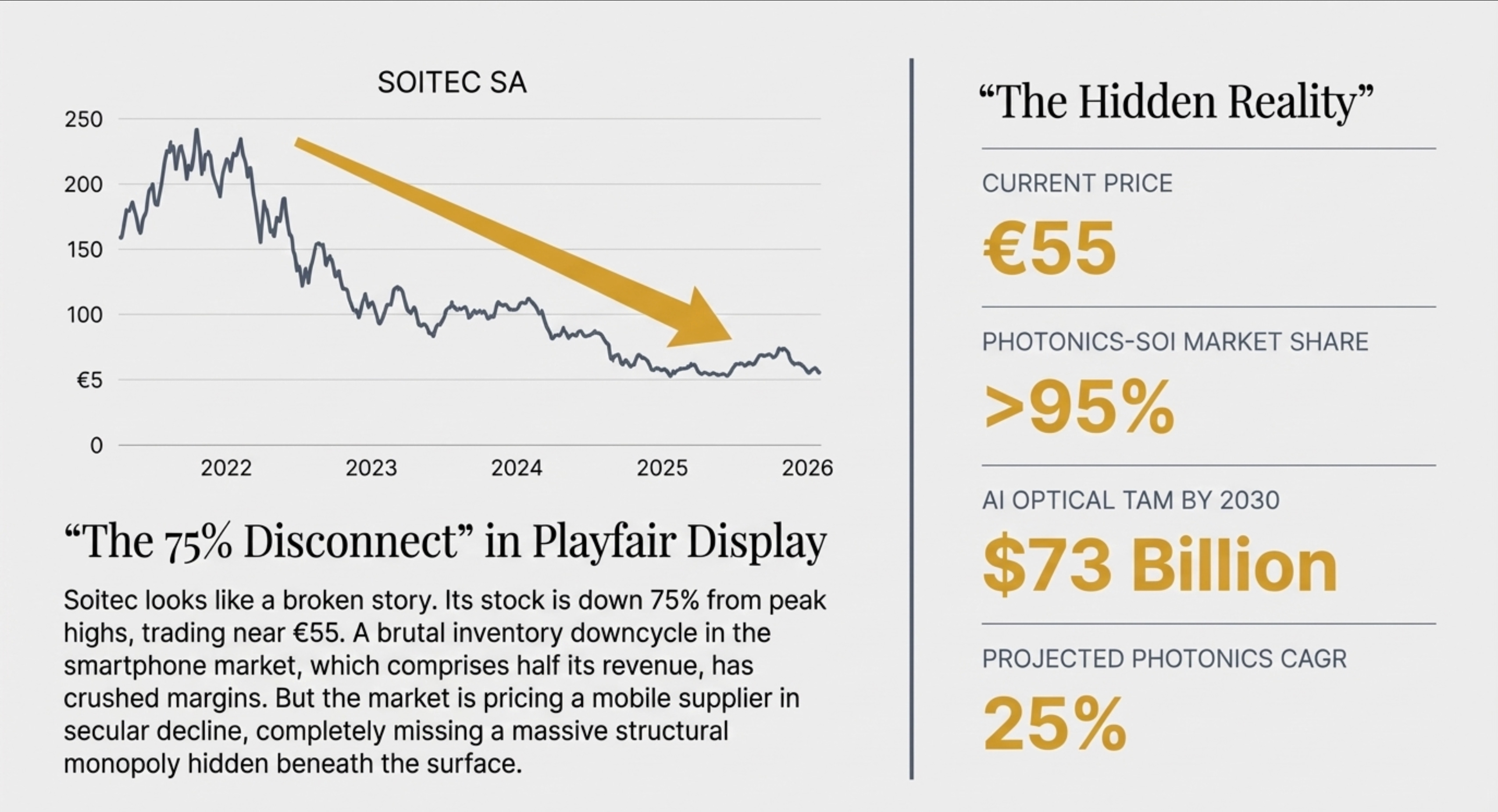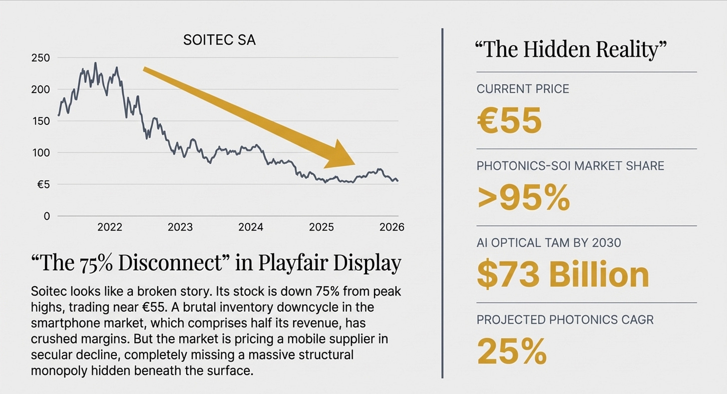 The stock peaked above €230 in 2021 during the smartphone supercycle. Today it trades around €55. The market has priced Soitec as a mobile chip supplier in secular decline. It has completely failed to price in the future of photonics.