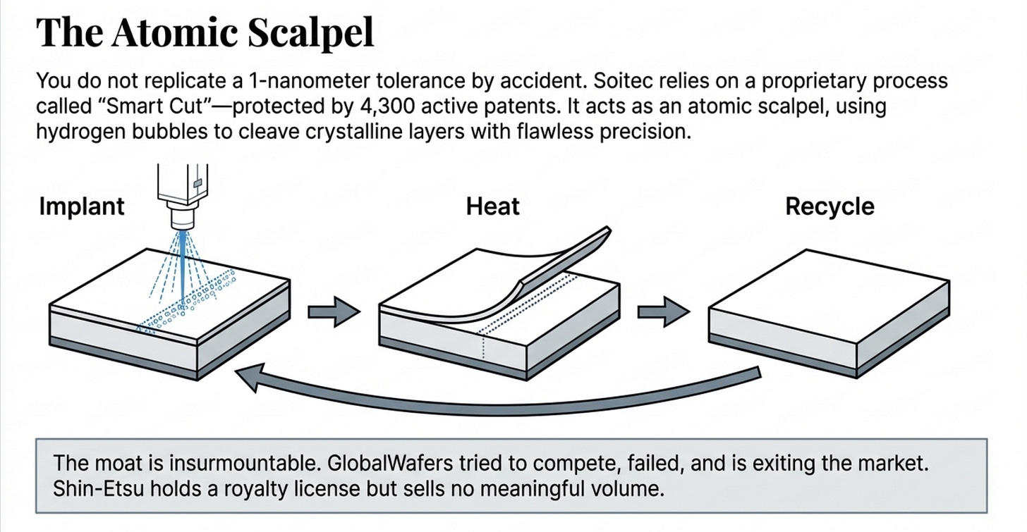 The product is called Photonics-SOI. Silicon-on-Insulator wafers engineered to a roughly 220 nanometer silicon layer sitting on a 2 micron buried oxide layer. The silicon thickness uniformity must be within 1 nanometer across the entire wafer. The defect density must be below 0.1 per square centimeter. These are not specs you replicate by accident. They require a proprietary process called Smart Cut, a hydrogen ion implantation and thermal cleave technology that Soitec has spent 30 years refining into approximately 4,300 active patents worldwide.