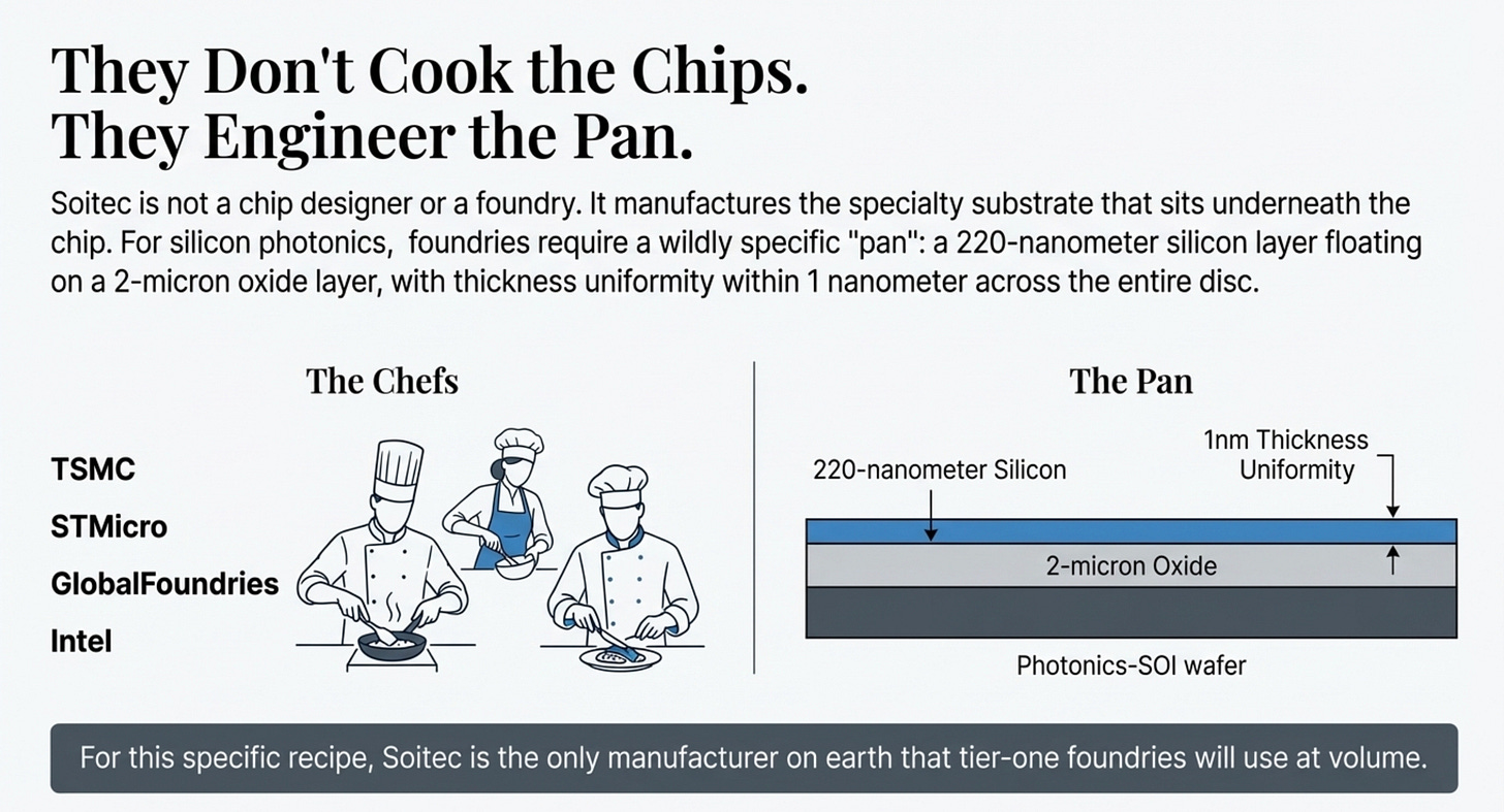 Soitec is not a chip designer. It’s not a foundry. It makes the engineered semiconductor substrate, the specialty wafer that sits underneath the chip. Think of it this way. TSMC, Tower Semiconductor, GlobalFoundries, STMicro, these are the chefs. Soitec makes the pan. And for one specific category of pan, the kind required to bake silicon photonics chips, they are the only manufacturer on earth that foundries will actually use at volume.