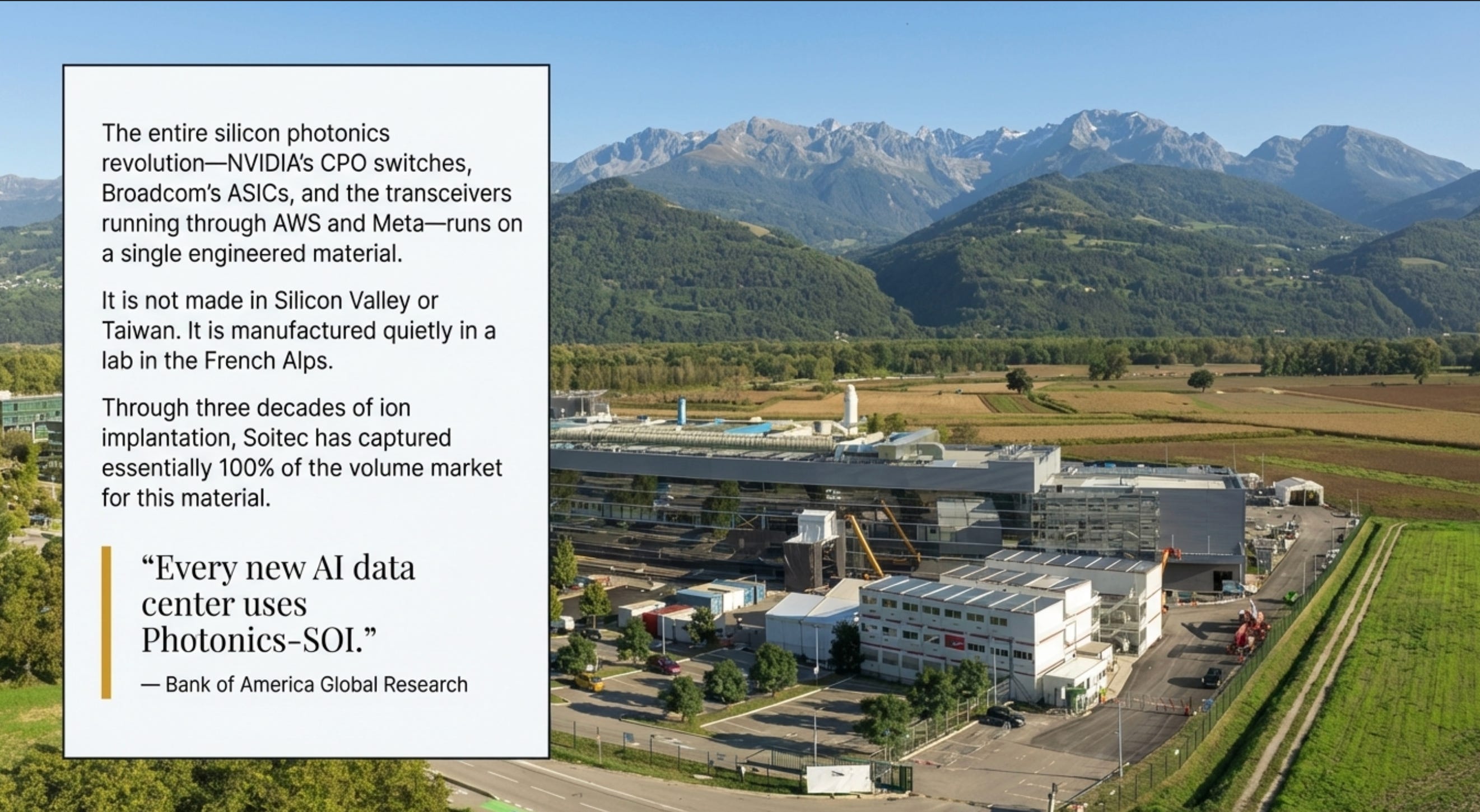 That leaves Soitec practically on their own in a market that Bank of America, in their March 2026 optical interconnects primer, estimates at greater than 95% market share for photonics-grade SOI.